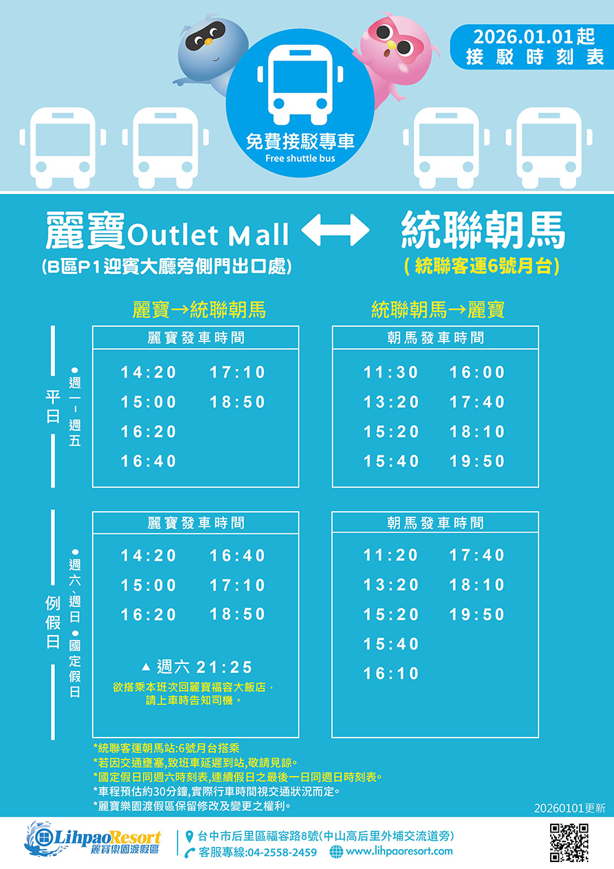 • 麗寶OUTLET MALL⇌台中朝馬站(朝馬 統聯客運6號月台) 2026/1/1起
